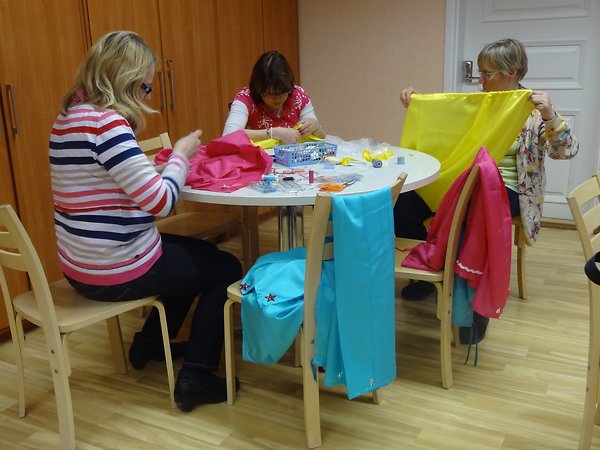 Huhtikuisena keskiviikkoiltana kokoontui Haapajärven seurakunnan pyhäkouluopettajia ja työntekijöitä ompelutalkoisiin. He valmistivat roolivaatteita "Onnellisten hetki" -näytelmään, joka nähdään herättäjäjuhlilla lauantaina pyhäkouluhetkessä.
