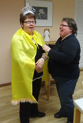 Hilkka Nikulalla viitta yllään, Tarja Rönkkö auttaa.