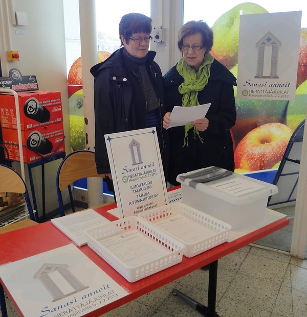 Haapajärven herättäjäjuhlia varten on tehty monenlaisia talkoita, ja juhlien ajaksi talkoolaisia pyydetään tehtäviin monin eri tavoin. Toukokuun alussa toimikunta jalkautui paikkakunnan marketteihin jakamaan talkoolaiseksi ilmoittautumiskaavakkeita.