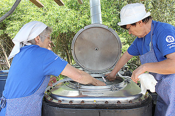 Leena Kähkönen ja Aino Harsia huolehtivat lihakeittopadan tarkoin puhtaaksi.