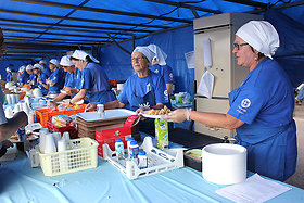Keittiötalkoolaiset ovat paikalla aamukuudesta iltakymmeneen saakka. Viikonlopun aikana näillä padoilla pyörii arviolta 500–700 työvuoroa. Ja yhteenkin vuoroon tarvitaan paljon väkeä. Ruoan valmistamisen lisäksi töitä riittää myös tiskaamisessa ja puhdistuksessa.