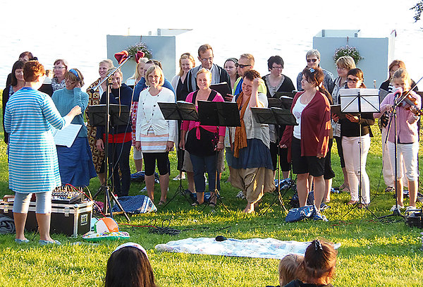 Pieni Valo kutsui seuraväkeä lauantai-iltana pihavaloon, iltatapahtumaan kuulemaan ja vähän laulamaankin. Kutsu oli kuultu ja rannalle kokoontui runsaslukuinen joukko. Pieni Valo -kuoron johtaja Annika Mäkelä toivoi kuoron moton, ilon, valon ja yhteyden välittyvän kaikille.