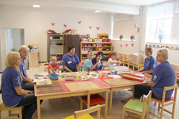 Herättäjäjuhlien ajan seurakuntatalon päiväkerhotiloissa on käynyt iloinen vilske. Perjantai-illasta alkaen on tarjottu 3-7 –vuotiaille lapsille ohjattua, turvallista tekemistä 4 aikuisen ja yhden nuoren pyörittämässä lastenhoitopaikassa. Työvuorossa olleet Marita Seppälä, Sinikka Laajala ja Eija Siipola kertovat, että kerrallaan on ollut enimmillään 19 lasta hoidossa. Sesonki ajoittui lauantain iltapäivään. Hiljaisimpia ovat olleet aamupäivät. Kerrallaan lapsi on voinut viettää hoitopaikassa 2 tuntia, mutta monet lapset ovat käyneet juhlien aikana useamman kerran. Lapset ovat askarrelleet, leikkineet ja pelanneet. Varsinkin iltapäivisin lapset ovat hiljentyneet kuuntelemaan satuja ja muuta aikuisen lukemaa.