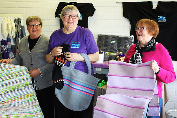 Herättäjäjuhlien topakat talkootytöt Eila Kortelainen, Maija Korhonen ja Kaija Heikkinen esittelevät käsitöitä juhlamyymälässä.
