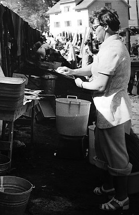 Eila Kortelainen talkoissa Sotkamon juhlilla 1971 Pajaniemen kahviteltassa.