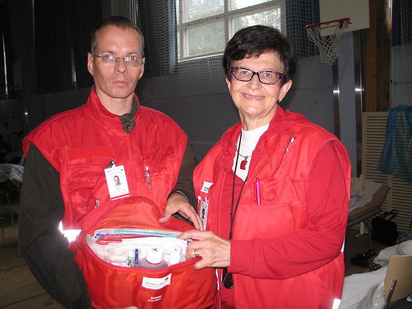 Pirkko ja Tero tekevät lauantaina pitkän vuoron aamuseitsemästä iltayhdeksään. Osan ajasta he palvelevat ensiapupisteessä, osan kiertävät ulkotiloissa. Laukusta löytyy ensiaputarvikkeita ja sadetakkeja.