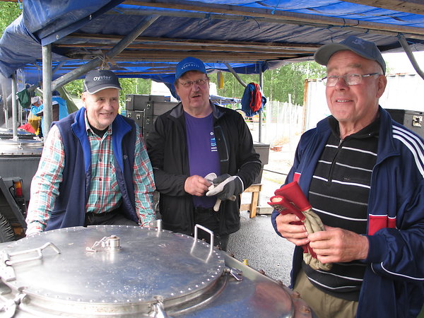 Soppatykit porisevat Jussi Tohnin (vas.), Olavi Meriläisen ja Väinö Kujalan valvonnassa.