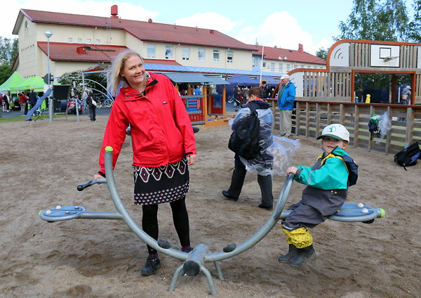 Helsingistä kotoisin oleva Heidi Zitting kuunteli sunnuntaina messua Salmelan koulun leikkikentällä. Keinussa istui hänen kolmivuotias poikansa Niilo Kotilainen.