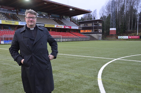 Hannu Pöntinen tulevien juhlien juhlakentällä, Myyrmäen stadionilla.