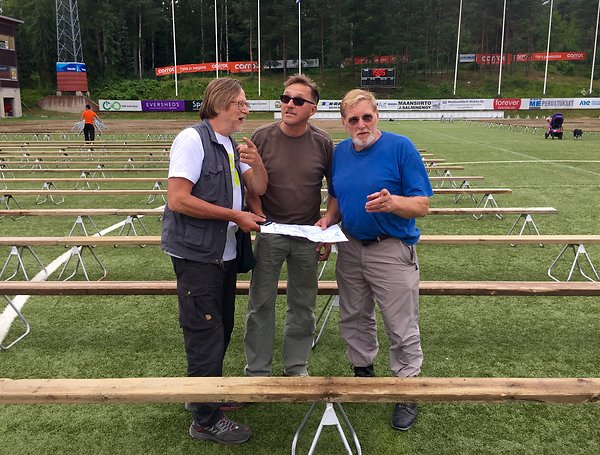 Juhlien rakentaminen on hyvässä käynnissä. Taisto Hintsanen (vas), Jorma Alasaari ja Juha Turja juhlakentällä suunnittelemassa.