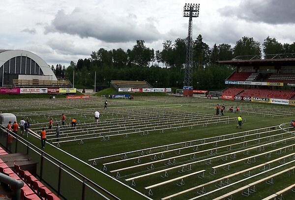 - Rakentaminen on alkanut jo viime viikolla, mutta nyt maanantai-aamuna päästiin itse alueelle ja kokoamaan seurapenkkejä, kertoo kenttätoimikunnan puheenjohtaja Taisto Hintsanen kiireisen rakennuspäivän keskeltä.
