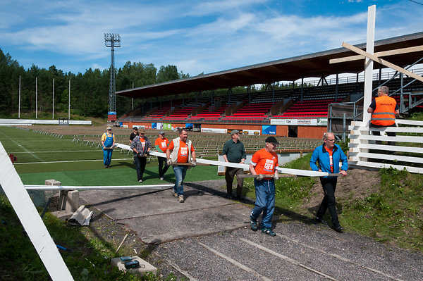Joka puolella jalkapallostadionia hyörii talkoolaisia oransseissa Ground crew – talkoolainen -paidoissaan. Jollakin on kädessä saha, toisella vasara, osa kantaa lautoja tai muita tarvikkeita. Mönkijä kuljettaa tavaroita pitkin penkkirivejä.