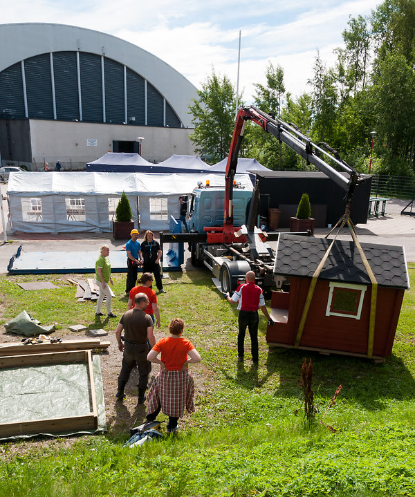 Hetken päästä paikalle tuotiin myös leikkimökki, joten pienimmille riittää puuhaa. Elleivät he sitten ole juhlien perhepäivänä lauantaina Energia Areenalla, jossa järjestetään ohjelmaa perheille ja nuorille sekä juhlien isot konsertit.