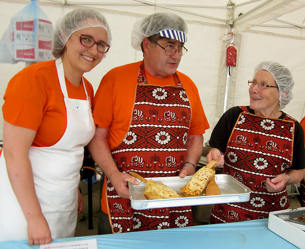 Herkullinen tuoksu oli houkutellut melkoisen jonon juhlavieraita lettukestien äärelle ja ahkerat talkoolaiset palvelevat alttiisti.