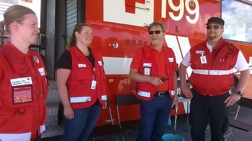Vuorossa olevat ensiavun ammattilaiset Mika Pellikainen oik. Markku Lempinen, Reeta Paukku ja Saana Sahlstedt tärkeän ajoneuvon vierellä.