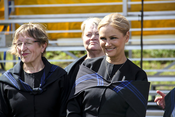 Eija-Riitta Korhola (kuvassa oikealla) sai körttipuvun lahjaksi ystäviltään.