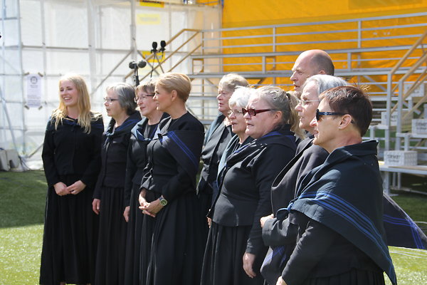 Kuorokatoksen eteen kokoontuneet körttipukuiset veisasivat yhdessä Herraa hyvää kiittäkää -virren.
