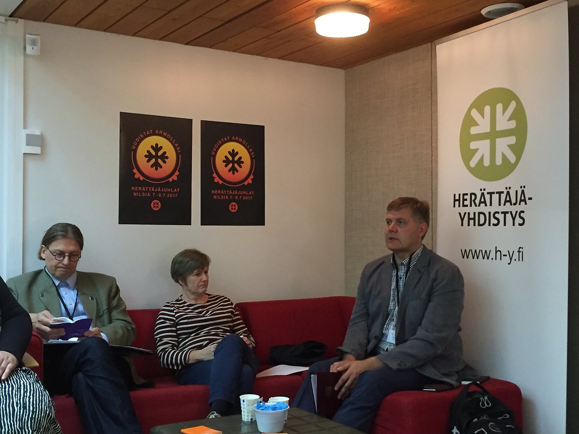 Herättäjä-Yhdistyksen puheenjohtaja ja Siionin virsien uudistustoimikunnan tekstijaoston puheenjohtaja Jukka Hautala, Siionin virsien uudistustoimikunnan sävelmäjaoston puheenjohtaja Ulla Tuovinen ja Herättäjä-Yhdistyksen toiminnanjohtaja Simo Juntunen. Kuva: Kaisa Viitala