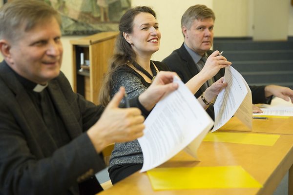 Tuomiorovasti Olli Hallikainen, Tampereen aikaisempi pormestari Anna-Kaisa Ikonen ja Herättäjä-Yhdistyksen toiminnanjohtaja Simo Juntunen allekirjoittivat kaupungin, seurakuntien ja Herättäjä-Yhdistyksen yhteistyösopimuksen herättäjäjuhlien järjestämisestä Kalevan kirkolla helmikuussa 2017. Kuva: Hannu Jukola