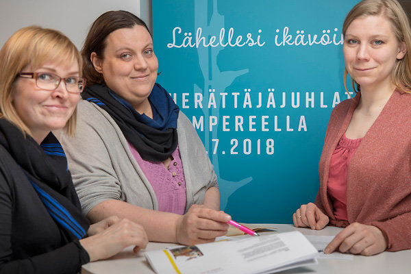 Tampereen kaupungin vammais- ja esteettömyysasiamies Hanna Karojärvi (oik) , pääsihteeri Petra Perttula ja majoitus- ja talkoosihteeri Heidi Mansikkala