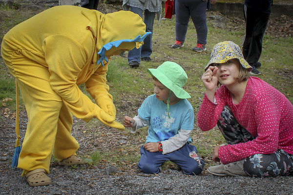 Mattilan perheen lapset etsivät maasta kiitollisuuskiviä Leku Leijonan kanssa. Kuva: Tuula Tarvainen