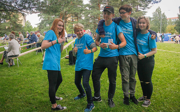 Juhlakentällä vastaan pyörähtää Herättäjä-Yhdistyksen Aholansaaressa järjestämälle rippileirille osallistunut joukko nuoria. He toimivat juhlilla tänä vuonna nuorina talkoolaisina ja mukana on ensikertalaisia.