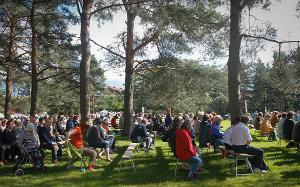 Perjantain veisuuhetki houkutteli juhlakentälle mukavasti väkeä verryttämään äänihuulia virsienkin täyteistä viikonloppua varten. Kuva: Katariina Järvi