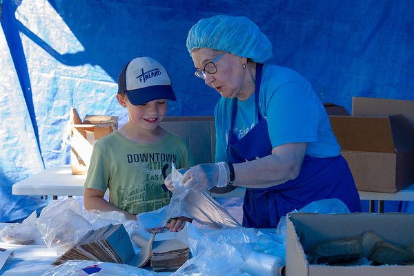 Teemu Juhola ja Raili Salmesvuoroi aterimia pussittamassa,.