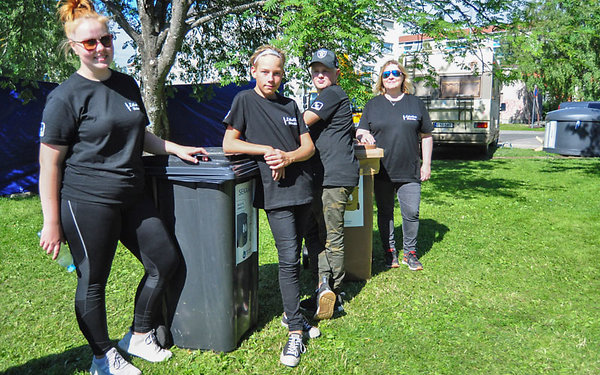Seka- ja biojäteastiat erottaa toisistaan ison tarran lisäksi väri. Alueella on myös astiat lasille ja metallille, mutta sisältöä niihin on tullut vähän. Paperia ja kartonkia sen sijaan kertyy.