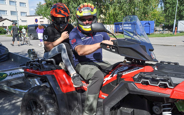 Reeta Kulo ja Jukka Kulo lähtevät mönkijällä matkaan, viemään roskasäkkejä pois alueelta.