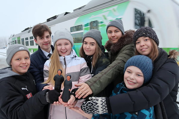 Aava ja Armas ja iloiset tervetuloseremoniat Nivalan asemalla.