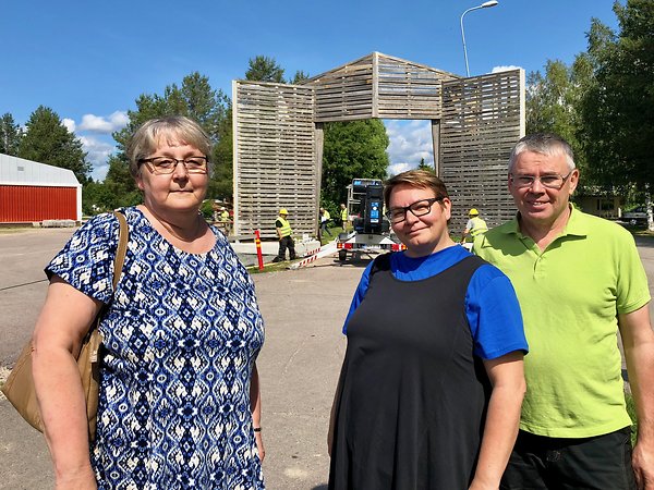 Herättäjäjuhlien pääsihteerit Riitta Muilu ja Jarmo Vuolteenaho sekä juhlatoimikunnan puheenjohtaja, kirkkoherra Sanna Jukkola ovat tyytyväisiä juhlakentän talkoisiin. Taustalla rakentuu juhlaportti.