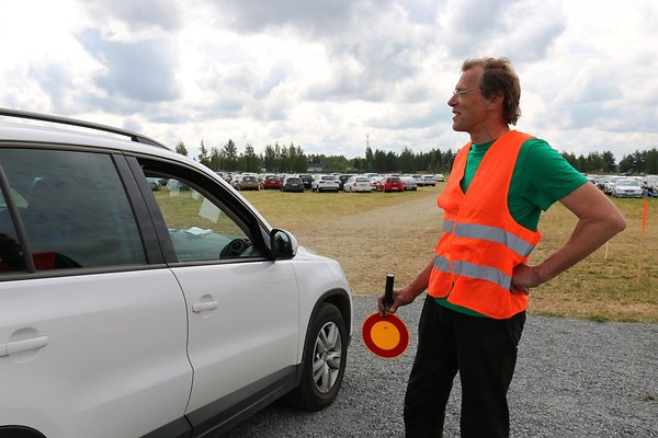 Antero Erkkilä ohjasi henkilöautoilijoita Peltoparkin risteyksessä. - On ollut merkillepantavaa, kuinka iloisia ihmiset ovat olleet. Lauantaina syntyi hieman jonoa ja tulijat joutuivat odottelemaan, mutta he ymmärsivät senkin tilanteen, hän sanoi.