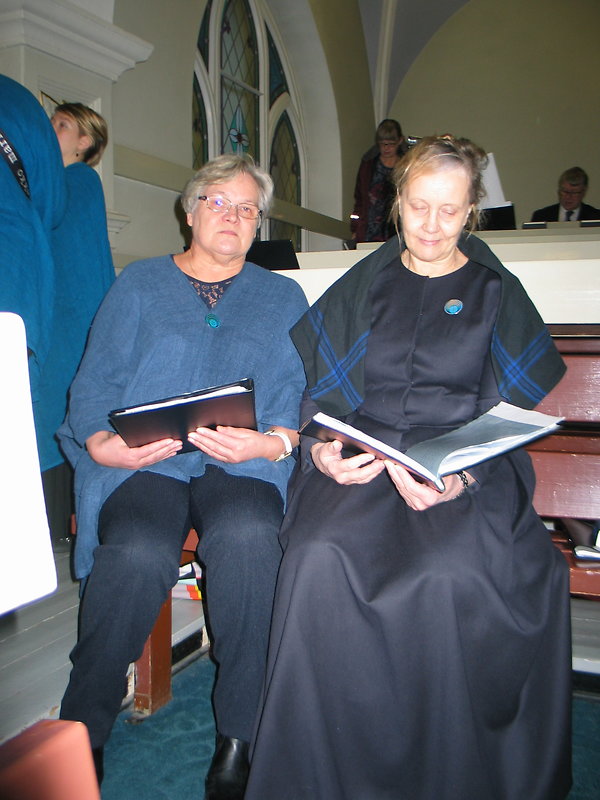 Herättäjä-yhdistyksen valtakunnallinen kuoro harjoitteli omaa osuuttaan päivän messuun. Useista kymmenistä henkilöistä koostuva kuoro lauloi kauniisti useita virsiä. Kuorolaisten tummat asut täydensivät kuoron sanomaa. Erityisesti huomiota kiinnitti perinteinen körttipuku, joka oli Eija Pohjostenperän yllä. Eija kertoi olleensa mukana kuorossa kaikkien johtajien, myös kuoron perustaneen Väinö Viitasalon aikana, lähes 30 vuotta. Vieressä istui lapualainen Sanna-Liisa Luoma, joka kertoi olleensa mukana kuorossa noin 15 vuotta. Kuva Päivi Kleimola