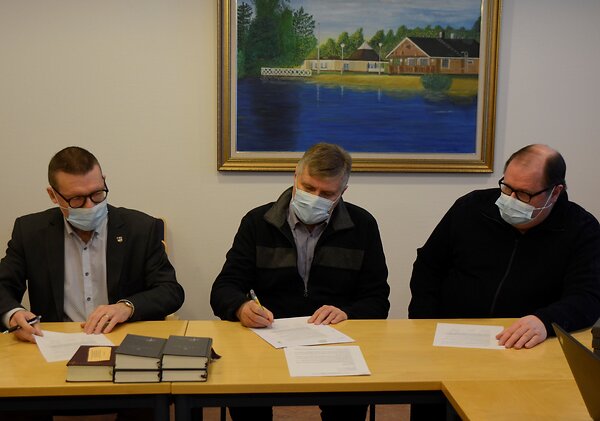 Kauhavan kaupunginjohtaja Markku Lumio, Herättäjä-Yhdistyksen toiminnanjohtaja Simo Juntunen sekä kirkkoherra Jyrki Jormakka päivittivät allekirjoituksillaan sopimuksen Kauhavan herättäjäjuhlista 2021.