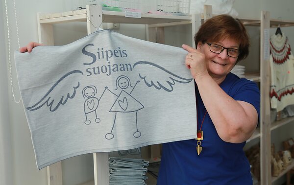 Herättäjäjuhlat 2021 Kauhava - juhlakauppa - Hannele Kihlman esittelee Siipeis suojaan pellavapyyhettä