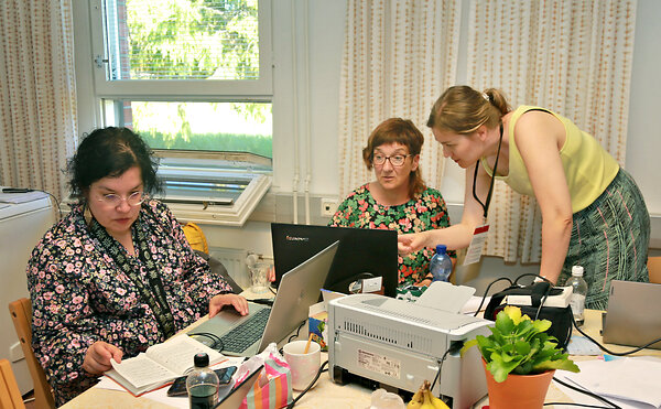 Ulla MItrunen, Johanna Sointula ja Tanja Roiha Kauhavan virtuaalisten herättäjäjuhlien mediakeskuksessa. Johanna Sointula on tehnyt pitkän uran Herättäjä-Yhdistyksen palveluksessa.