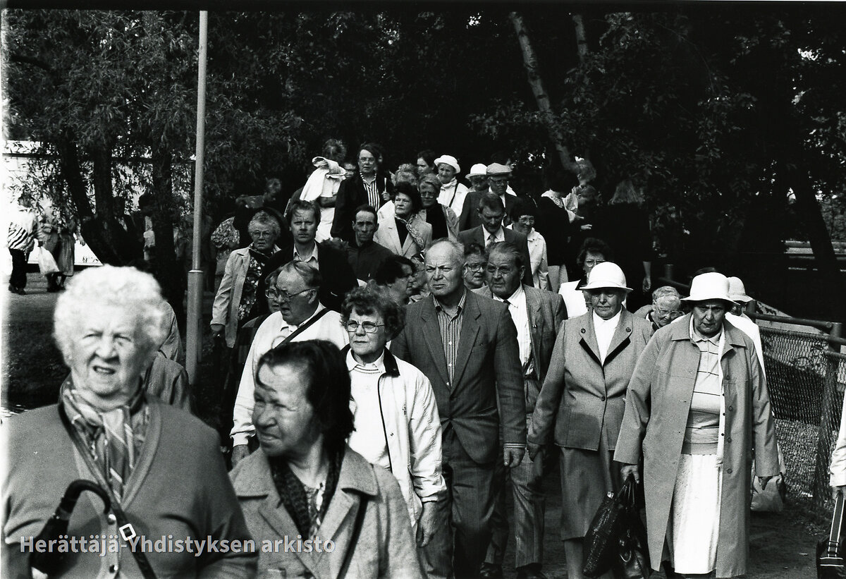 Herättäjäjuhlat Porissa 9.-11.7.1993. Juhlayleisöä. Kuvassa edessä toinen oikealta Hanna Holi (o.s. Alho). Keskellä istumassa kasvot kameraan päin Anna Maunula (o.s. Huotari). Hänen vasemmalla puolellaan istumassa sivuttain Vuokko Rankinen. Mikkelistä kotoisin kaikki.