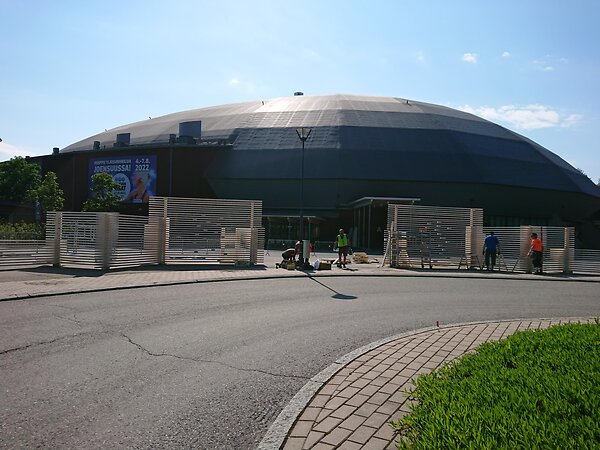 Volunteers building the festival gate in front of Joensuu Areena.