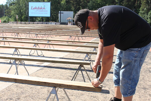 Johannes Kortelainen kiinnittää laattaa seurapenkin päähän.