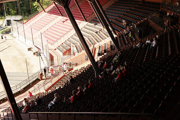 Helteisen kuumalla stadionilla kävi kevyt virkistävä tuuli ja puhuttiin lohdutuksesta. Torstain talkooseurojen vieraat etsivät paikkaa varjosta, mutta varjopaikkoja oli onneksi hyvin tarjolla. Stadion sopii hyvin yhteisveisuuseen.