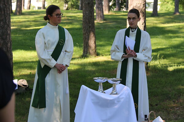 Pauliina Martikainen ja Anna-Maria Kupiainen jakoivat ehtoollisen vaeltavassa messussa. Kuva: Pertti Meriläinen.