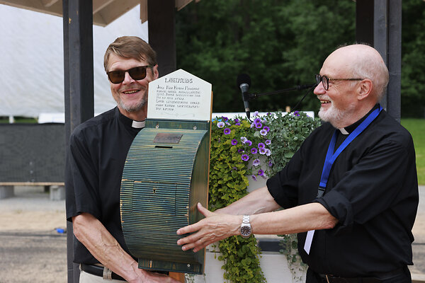 Joensuun herättäjäjuhlatoimikunnan puheenjohtaja Petri Karttunen (oik.) luovutti herättäjäjuhlien järjestelyvastuuta symboloivan herännäisjohtaja N. G. Malmbergin lähetyslippaan Seinäjoen juhlatoimikunnan puheenjohtajalle, kirkkoherra Jukka Salolle.
