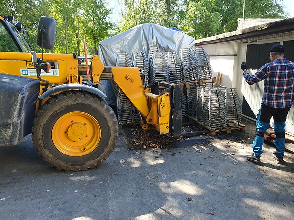Syksyn lehtiä löytyi penkkitukien alta, kun niitä siirrettiin kentälle kurottajalla. Penkkejä tukineen on ollut varastoituna juhlakentän lähellä viime syksystä alkaen.