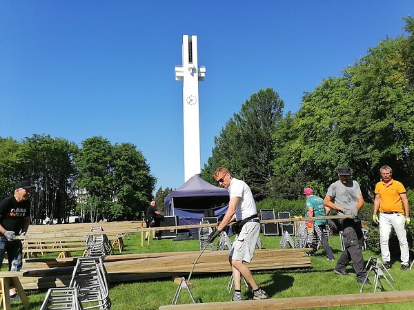 Kökkäväki panee penkkejä ojennukseen seurakentälle keskiviikkona. Työn touhussa uurastavat lapualainen Heikki Nikkola (vas.), vaasalainen Olli Autio, jyväskyläläinen Jari Äijänen ja laihialainen Jyrki Leppilahti. Penkkien jalustoja kantaa seinäjokelainen Anssi Kari. Kuva: Jari Karjanmaa