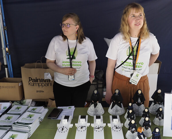 Seinäjoen seurakunnan myyntipöydän takana iloitsevat pastorit Anna Merivirta ja Auli Härkönen siitä, että herättäjäjuhlien kassaan menevän tuotemyynnin käsityöt, Lakeuden Ristin kello sekä Liisa Pihlajan ideoimat körttihahmot ovat ilahduttaneet juhlaväkeä.