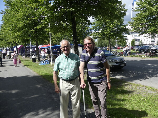 Herättäjäjuhlilla myös poliitikot tapaavat toisiaan. Näin kävi valtiopäiväneuvos Jukka Vihriälän tavatessa Panu Laturin seurakäytävällä. Valtiopäiväneuvos oli erityisen ihastunut onnistuneeseen juhlapaikan valintaan. Varjoisa puistoalue tarjosi seuravieraille auringonpaisteella viilennystä.