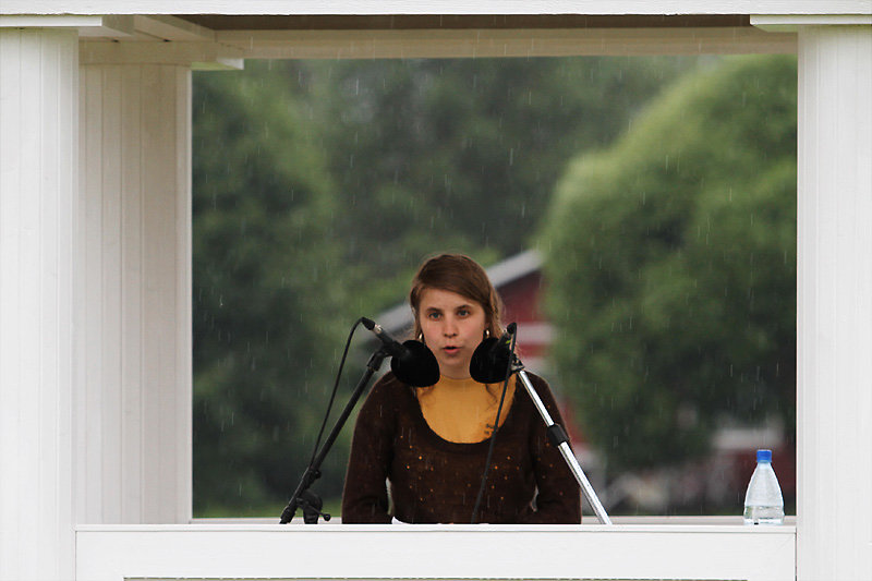 Jussi Seppälä Porista suojasi virsikirjan sateelta.