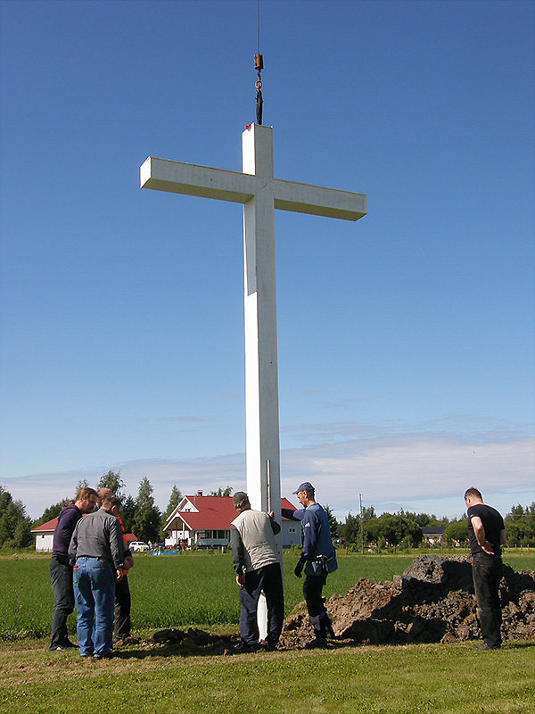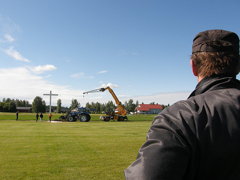 Kenttäpäällikkö Mikka Nuuja seuraa ristin pystytystä.