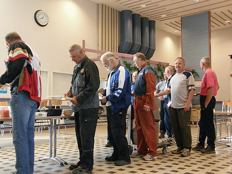 Kenttätöitä tehnyt talkooväki ruokailee Isonkyrön koulukeskuksen ruokasalissa.
